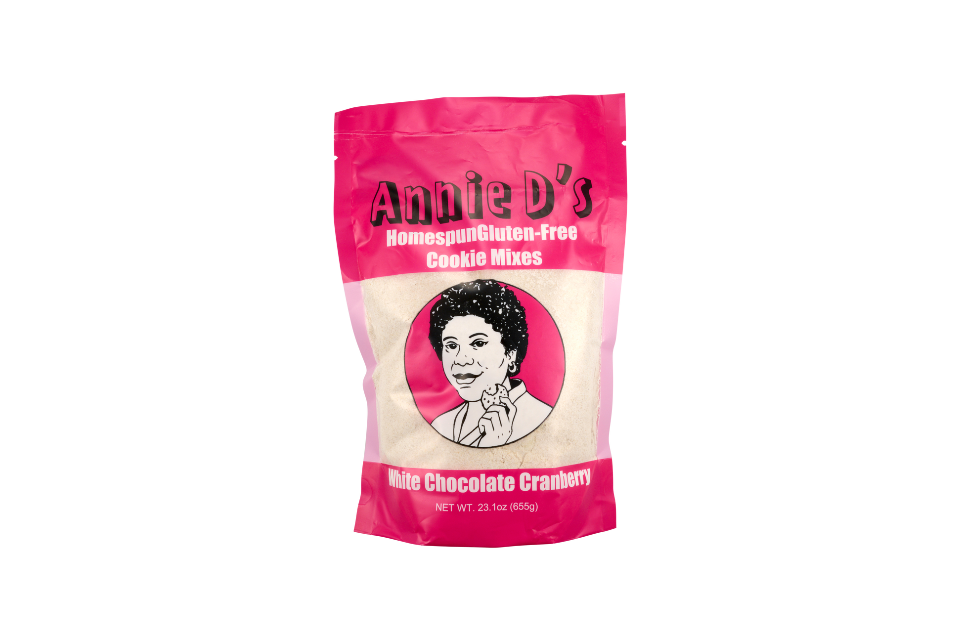 WHITE BAKING CHIPS (CANE SUGAR, PALM KERNEL & PALM OILS & COCOA BUTTER, NONFAT MILK, MILK FAT, SUNFLOWER LECITHIN, TAHITIAN VANILLA), BROWN SUGAR, DRIED CRANBERRIES (CRANBERRIES, CANE SUGAR, SUNFLOWER OIL), ORGANIC BROWN RICE FLOUR, GLUTEN FREE SORGHUM FLOUR, SUGAR, ARROWROOT FLOUR, POTATO STARCH, CREAM OF TARTAR, BAKING SODA, XANTHAN GUM, SALT.
